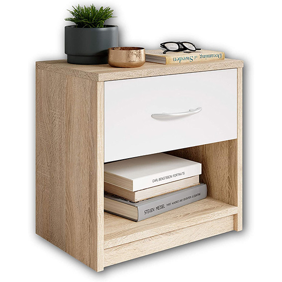 Mesita de noche con un cajón de color roble sonoma y blanco.